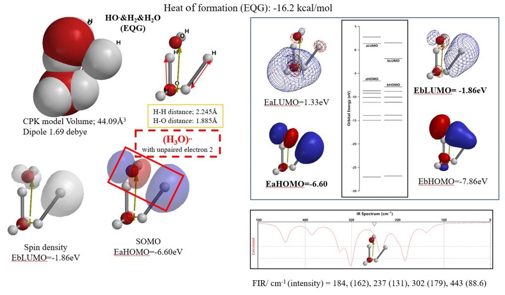 - Obtaining the three-dimensional structure of the aggregate [H2&HO.&H2O] is to verify and predict the transition state of the reaction and the reaction intermediate. By calculating the structure (single point, SPE) obtained by the molecular mechanics method (MMFF) of a molecular assembly, the reaction transition structure of HO.&H2&H2O (SPE) will become apparent (Case 1-1). The equilibrium geometry HO.&H2&H2O (EQG) obtained by DFT/MM corresponds to a possible reaction intermediate structure (Case 1-2).
